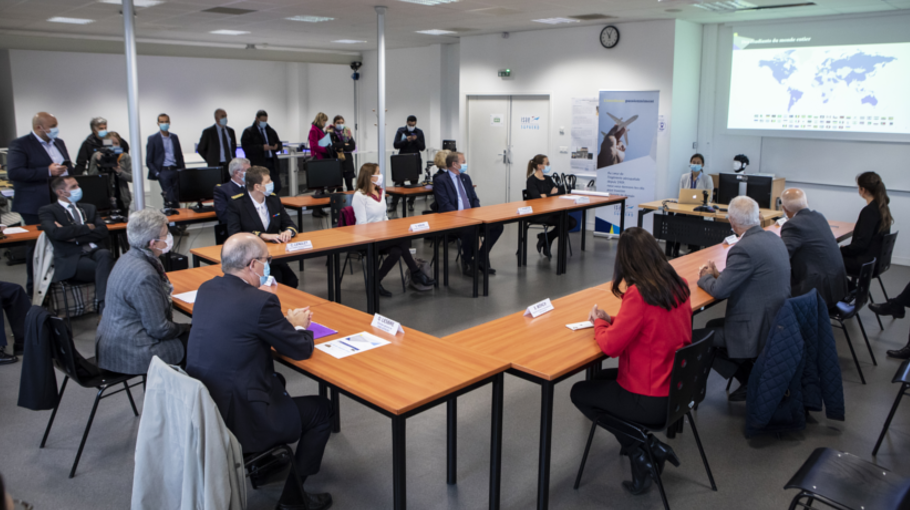 La ministre a ensuite pu découvrir l’InnovSpace récemment inauguré, qui distribue l’innovation dans l’ensemble de l’établissement et se propose d’être un dispositif complet de formation, d’incitation et de facilitation. Une présentation de ces locaux collaboratifs et du dispositif d’accompagnement des étudiants et des futures start-up faite par Dan Nguyen chargé de mission et entrepreneuriat à l’ISAE-SUPAERO. Madame Darrieussecq a pu échanger avec des étudiants et de jeunes alumni dirigeant de start-up. Florian Rosselli lui a montré les réalisations de I-CARE, expérience étudiante, soutenue par l’ISAE-SUPAERO et sa Fondation, ayant pour objectif d’étudier la faisabilité de capturer des objets spatiaux grâce à un bras robotique. Thomas Bessiere, co-fondateur de la jeune start-up Hinfact lui a retracé les débuts de son aventure entrepreneuriale, de la Spin-off de l’ISAE-SUPAERO, autour d’un partenariat avec le laboratoire de Neuroergonomie et des facteurs humains à l’entreprise qui développe des logiciels pour objectiver les sessions de formation et améliorer les performances des pilotes et des instructeurs dans le transport aérien.