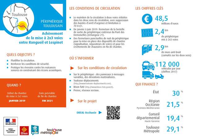 La direction des routes Sud-Ouest, sous maîtrise d’ouvrage DREAL Occitanie, va faire réaliser des travaux d’achèvement de la mise à 2x3voies du périphérique sud de Toulouse sur la section Rangueil/Lespinet, à compter de janvier 2019 et pour une durée de 3 ans environ.
